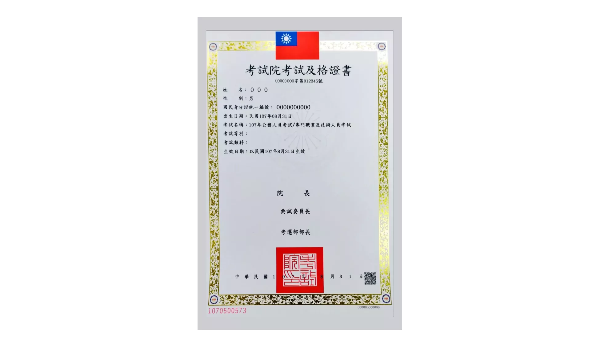 In Taiwan, people who want to be 38 kinds of occupations, including lawyers, civil servants, doctor ..., must pass the "National Exam"(國家考試). After finishing the exam, they could apply for the paper version of "Qualified Certification" (考試及格證書) with the website or over-the-counter service. Most of the activities need to use the certification, including pre-service training sign-up, registration for practice, and job hunting, showing the certification is essential for a examine.