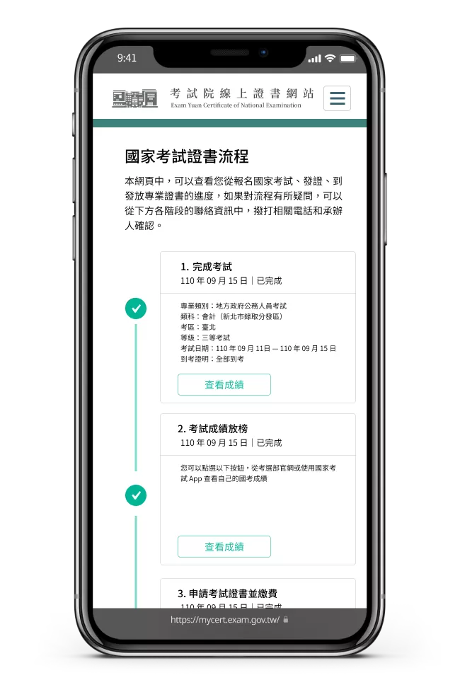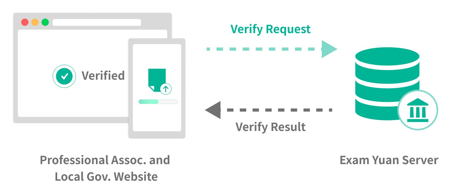 After user passed the National Exam, qualified examinees will recived a email with e-certification website link from Exam Yuan. User could login with Mobile ID, FiDO App or NHI Card. After check the personal infomation, user would donwload the e-certification PDF. PDF have E-Signatures which can prove the correctness of the certification.