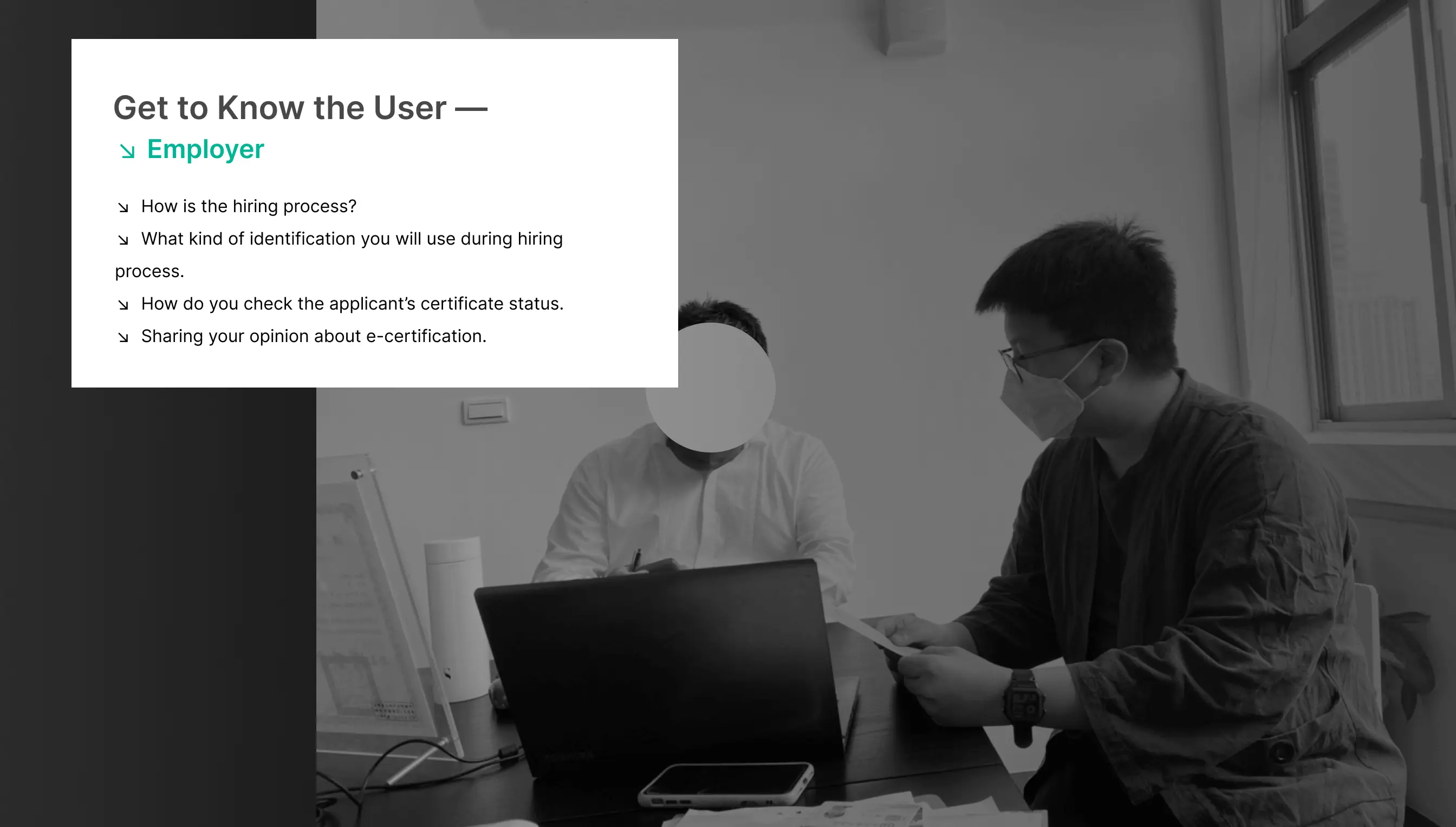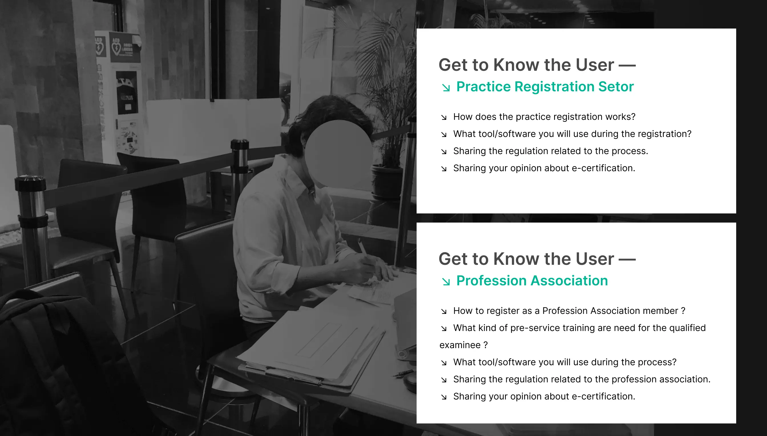 To better know who should be interview, and framing the field of design, I design a stakeholder map from client’s material. In this project we only focus on stakeholders related to 12/38 kinds of occupations in the map. As shown as the map, objectes be sorted into 4 groups, from inside to outside “Examinee”, “Profession Association”, “Practice Registration Sector” and “Employer”. The more inside stakeholders are, the more change to use the applying service.