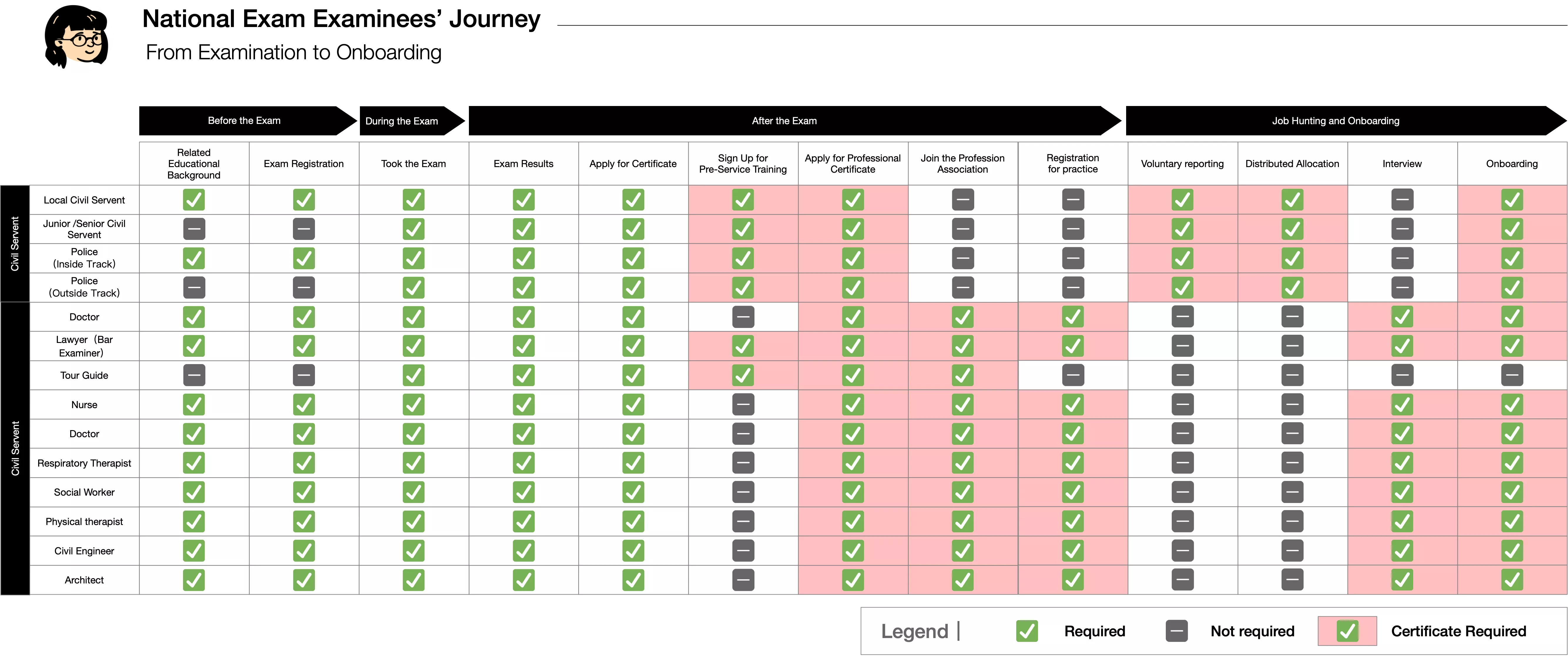 After the interview, we found four kinds of activity also need the “Qualification Certification”; That is “pre-service training”, “Professional Certificate Appling”, “occupational registration” and “job-hunting”. When we design the e-certificate service, should also take that four kinds of activity into account, to build a gapless applying service.